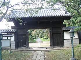 | 右上の広場の隅にある下館藩主石川総管の墓。 | 観音寺の門。まるで城の現存門といった雰囲気がある門である。 |