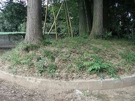 | 西側に向かうと土塁は弧を描いて、幅も細くなる。 | 土塁上北東の角に置かれている、氏神様の祠。 |