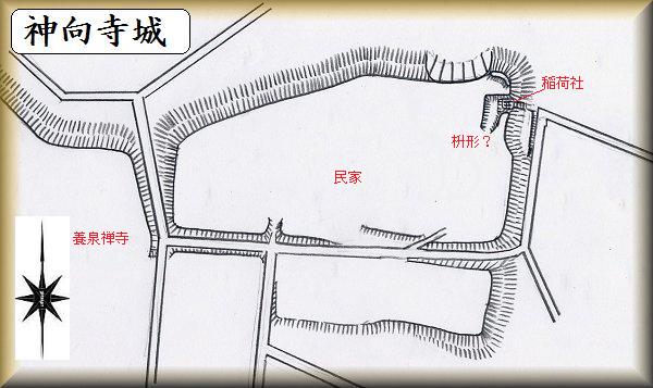 神向寺城は、下根本の熊野神社の北側200mほどの所にある。熊野神社から北側に道を下っていくと、下りきった辺りの先の左手の竹やぶの中に、土手のようなものが見える。これが城址である。すぐ北側の二条城と向かい合うような位置にある。