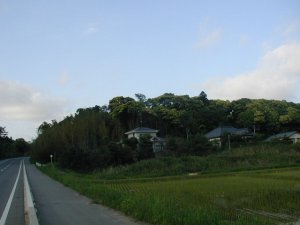 | (以前の記述)二条城は東条城の1.5km西側にある。県道5号線の旧道沿いに、愛宕神社のある小高い丘が見えるが、城址はその北側に向かい合っている比高10mほどの低い丘陵上である。城址の北側を写真の県道5号線が削っている。 城についての詳しいことは分からないが、東条城との位置から見て、東条城の支城と見てよいだろう。かつてはこの辺は沼沢地であったらしく、沼地に囲まれた小高い城には、そこそこの防御力があったのだろう。この辺りは伊佐津という地名だが、「津」という名からして、沼地の間を行き来するための小さな港があったところなのだろうか。 『城郭体系』には新利根町の「竹内城」というのがあり、「近衛光寿の城、天文年間、土岐氏に滅ぼされる。」とあるが、これはこの城のことらしい。また、伊佐津城という別称もあるということである。(ひづめさんより) |
