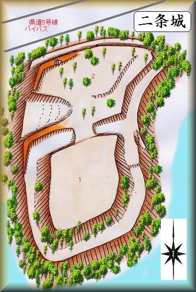 そういえば、比較的近場にも「二条城」という名称を有している城郭がある。もしかすると「二条」というのは、この地域にはわりと多く見られる地名で「御城(ミジョウ)」の転なのではないだろうか。。