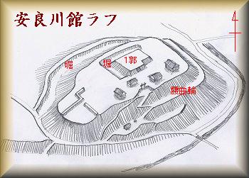 安良川館の遺構は現在は隠滅してしまっているため、どのような城であったのか知る由もない。仕方がないので「城郭体系」に載っている図を基にして鳥瞰図を描いてみた。しかし、どうも現地の地形とは合わないような感じがする。館のあった場所(高萩小学校)は、台地の東端にあり、北西側の台地基部から見ると、ちょっと地勢が低くなっている。北西にある八幡神社の辺りの方がなんとかなく城址らしい雰囲気があるのだが、まあ、ここは城というよりも、古い時代の館であったのかもしれない。