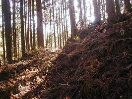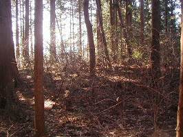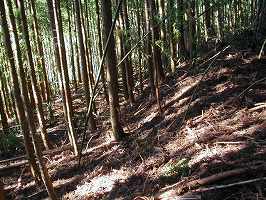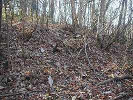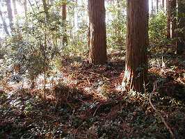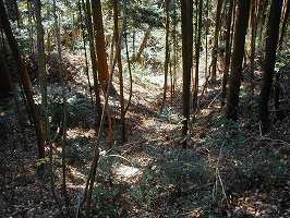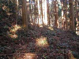 | 神社の背後から20mほど直登すると山頂の平坦地に到達する。しかし自然地形のままである。 | 山頂から10mほど下がったところに林道の跡のようにも見える腰曲輪がある。しかし遺構なのかどうかよく分からない。 |