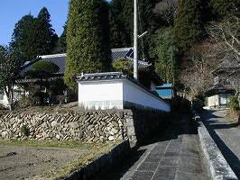 | 十殿神社の参道。脇に城壁と石垣をはべらせたお宅があり、こちらの方が居館のように見えてしまう。 | 高さ20mほどの石段を登った所に十殿神社がある。 |