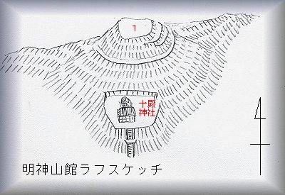 明神山館は、十殿神社のある山上にあったという。地元の方に伺ったところ「明神山」という山はあるが城館についてはよく知らないということであった。「高萩市の史跡と文化財」には「十殿神社が鎮座する」とあるので、中腹の神社のある高台も郭とみるべきなのであろう。しかし、実際の所、まともな平場はこの神社のある所だけである。