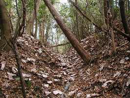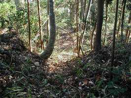 | Aの横堀。北側に向かって深くなり、最後は竪堀となって下に落ちている。この辺の城郭には珍しく竪堀が多用されているのがこの城の特徴である。 | Fの虎口から下を見た所。正面奥に見えるのが横堀の末端にある土橋Gである。 |