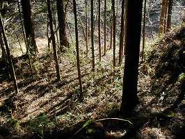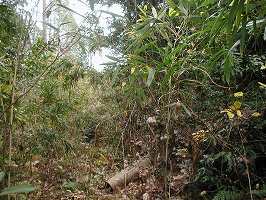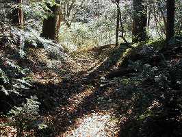 | 1の平坦地の脇には林道の跡のようなものが付いている。 | 1の北側の沢沿いに降って行くと4の削平地がある。この館ではここが唯一の人工的な削平地である。 |