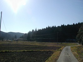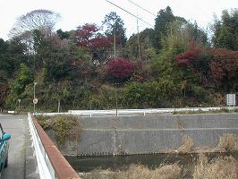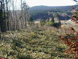 | 庄屋居宅跡を取り囲んでいる横堀。全域がこんな感じの笹薮になっているため、形態はさっぱり分からない。しかも棘のある木が多い。引っかき傷だらけになってしまった・・・・。 | 東南の花貫側にかかる端から城址を見た所。この辺りが城の南端に当たる。 |