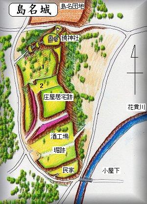 島名地区の「鏡神社前」のバス停から300mほど台地を上がっていくと鏡神社がある。花貫川の北西部にそびえている台地で遠目にも目立つので場所はすぐ分かる。この神社のある台地や、南側の台地上に城があった。神社のある台地は比高20mほど。周囲が切り立った独立台地である。