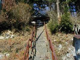 | 北側から見た寺山館。比高20mほどの台地の先端部近くにある。 | 何かの事務所のある平坦地から、上の薬師堂に上がる階段。これらの平坦地も居館の跡であろうか。 |