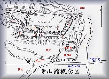 寺山館は、中の館とも呼ばれ、県道27号線と227号線とが交差する地点の北西にある比高20mほどの台地上にあった。この台地を上がって行くと何かの事務所があり、そこから石段があって、上の薬師堂に上がれるようになっている。この更に上の山頂部分に城址がある。ここにはかつて天台宗花園山金剛王院満願寺の末寺、十殿山不動院浄観寺があったが、元禄12年4月、水戸藩の社寺改革によって廃寺となったという。寺山という名称は、そのことにちなんでいるものと思われる。おそらく薬師堂はその名残であり、寺院は事務所のある高台辺りにあったのであろう。