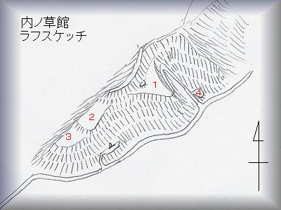 しかしここはヤブがひどい・・・・。耕作されていた畑地が放棄されたまま何の手入れもされていないためか、特に墓地の東南側一帯はまったく足を踏み入れることさえできないほどである。そういったこともあり、形状を把握できない部分が多いので、ラフスケッチに留めておく。このヤブを切り開かない限りまともな図面を描くことはできないであろう。