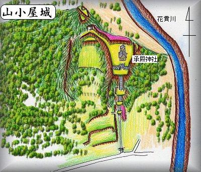 隣の北茨城市にも山小屋城があるが、山小屋は根小屋に対する山の城のことであろうか。この山小屋城は県道10号線の「秋山南」の信号機の北側に見える比高30mほどの山塊の中にある。前面には花貫川があり、堀の役目を果たしている。麓には集権の民家があり、その北側には承殿神社がある。神社の部分は独立した台地になっており、背後には削り残しのかなり大規模な土塁が見られる。また前面は3段階に郭のような切り立った小さなスペースがある。神社の背後は南西部に尾根続きになり、その先に高さ8mのまるで古墳のような高まりがある。この上にも小空間があり、ここも郭とみてよいだろう。