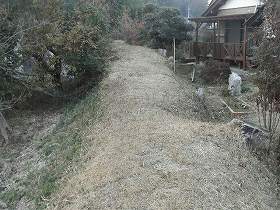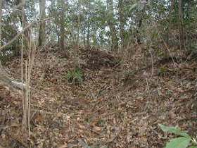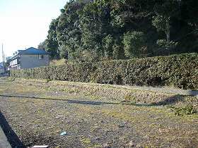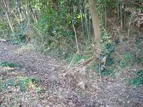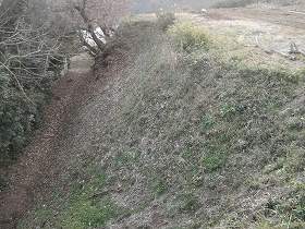 | 土塁のセンター側にはなぜか石棺が置かれていた。 | 台地下から南側の城塁を見たところ。こうしてみると、腰曲輪があるようにも見える。 |