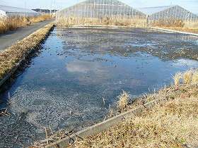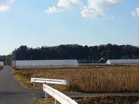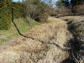 | 周囲にあるレンコン畑は、堀の跡っていう雰囲気がある。 | 神社のある妙見塚古墳の北側には、このような堀の跡のように見える地形がある。 |