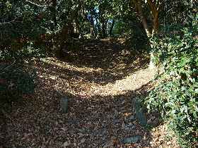 | 東南下の道路沿いにあるAの部分は堀跡のように見える。 | 虎口らしい部分。 |