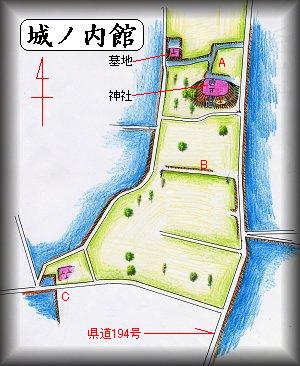 城ノ内といわれている部分は、その南側の一帯である。図のBの部分には堀跡の痕跡らしきものがあり、この南側に土塁らしきものが東西に伸びているのが見える。ただし、城内側から見ると、これは土塁というよりも、郭そのものが2mほど高い地勢にあるといった方が適当であるだろう。この長さは100mほどもあり、この南側の方100mほどの一帯が城ということになるであろうか。この段差は東側にも続いており、単郭の方形館といった形状を示している。しかし単郭方形の単純な館であるのに、「堀ノ内」「舘ノ内」ではなく、「城ノ内」と称しているというのはどうしてであろうか。「城ノ内」という地名は方形館よりも、もっと城郭らしいものを想像させる。あるいは城は方形館部分だけではなく、さらに周囲に郭を配置するという構造になっていたのではないだろうか。古い記録では「城は2町歩あった」とあるようで、そうなると、100m四方の館部分以外の郭も存在していたということになる。