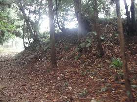 | 東側の城塁。東側には土塁はないが、5mほどの高さの切岸になっている。 | 北側の入口の土塁。高さは2mほどである。 |