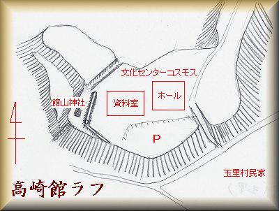 高崎館は、現在総合文化センターコスモスのある、比高15mほどの台地上にあった。しかし、この立派な文化センターが建設されたおかげで、城址はかなり破壊されてしまったようである。ところで、この文化センターには史料館も併設されている。ここの史料館は無料なので、ぜひ訪れてみるとよいであろう。それほど多くの展示物があるわけではないが、佐竹義宣書状などを見ることができる。