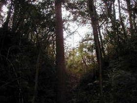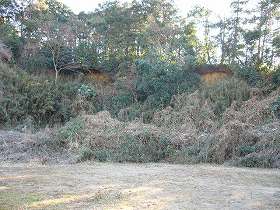 | 台地の大部分は削り取られ、栗の林になっている。左側の高台は削り残された部分。 | 台地の削られた部分を東側から見たところ。端の方はかなりオーバーハングしているので気をつけよう。 |