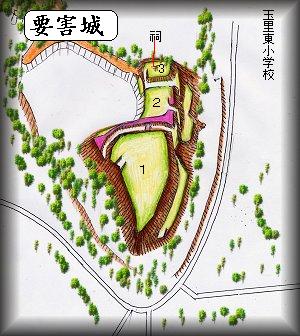 要害城は玉里東小学校の南西側にある比高20mほどの台地上にあった。台地の北西部分がかなり大規模に削り取られているが、南端の1郭と思われる部分は良好に残されており、明瞭な堀切も見られる。まさに要害といった感じである。