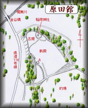 | (以前の記述)県道梶無川を渡る地点に金谷橋があるが、この橋の東南300mの所に原田館がある。比高10m余りの台地で、先端部が削られている。裏の方から台地上に上がっていくと、上には2軒のお宅がある。この辺りが館跡なのであろう。台地上には低い土の高まりがあるが、遺構と断定できるほどのものではない。崩された先端部に遺構があったのかもしれないが、こちらは旧状は不明である。 原田館は、天正年間、原田縫殿という者の居館であったというが、確かなことはよく分からない。 |