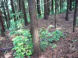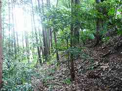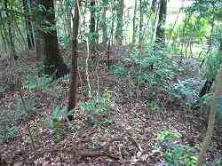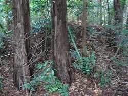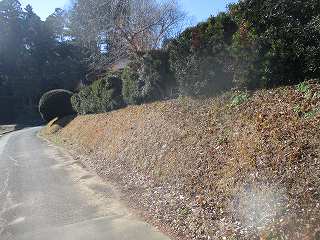 | Aの腰曲輪の城塁。この東側に、竪堀がある。 | Cの上の墓地の脇にはわずかに土塁が残っている。 |