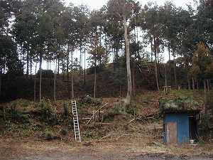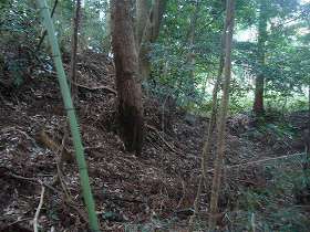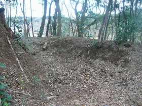 城域としては東南から北西に細長く延びた300mくらいの間があげられるだろう。この細長い区間を4条ほどの空堀で区画しているのだが、空堀といっても斜面の削崖は非常に甘い。これは古墳の形そのままなのだろう。それでも南端に近いところでは、写真のようにきちんと掘り切った部分も見られる。深さ3m、幅5mほどある。