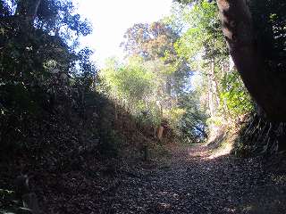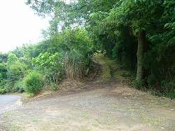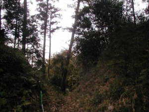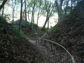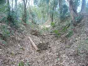 | 北側の城址入口部分。ここを上がっていった所が3郭となる。 | 2郭との間にある2の堀。深さ5m、幅は10mほどあり、かなり広い。 |