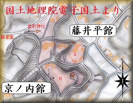 京ノ内館のすぐ北側の下の谷戸部には藤井平館があったという。図のAの部分である。