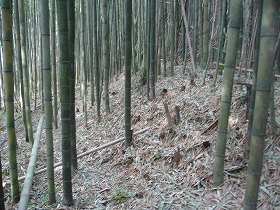 | 稲荷神社の建つ部分は、10m×5mほどの土壇となっている。曲輪にしては狭すぎるが、物見櫓でも建っていたのであろうか。 | 曲輪内部の大半は竹やぶとなっており、その中に1mほどの段差が認められる。 |