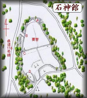 このように石神館は、後世の改変によって、かなりその旧状を失ってしまってはいるが、いかにも「要害」と呼ぶのにふさわしい地形は現在でも変わっておらず、城らしい地形を見ることはできる。