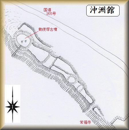 沖洲館は国道355号線の西脇、常福寺の北西側辺りにある。この辺りは古代の方墳が多いところで、館周辺にも、高さ5m以上の巨大な方墳がごろごろと並んでいる。館はこれらの方墳を取り込み、利用していたらしい。