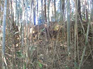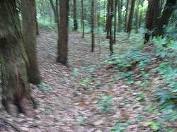 Cの東側下の城塁は、切岸加工を施されていない様子で、わりと傾斜が緩やかになっている。しかし、墓に行く参道の西側には人工的な削平地が見られる。一応、このあたりも郭と見てよいのだろう。