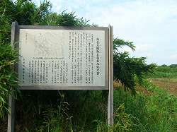 | 若常館の西側の城塁。この写真の右側にゴルフコースがある。館は比高10mほどの台地の先端部にある。 | 台地基部の道路脇にある「若舎人部広足の歌碑」と説明版。 |