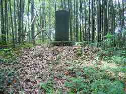 | 1郭からAの虎口を見たところ。土塁の先は、ちょっとした広場になっており、あるいはこれが枡形の名残であろうか。 | 1郭先端の土塁上に建つ「鳥名木城址」の石碑。 |