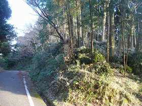 この台地は山林化しているようだが、山頂近くを道路が通っている。道路脇の部分が南北に長い平場になっており、そこが館跡ということらしい。