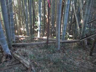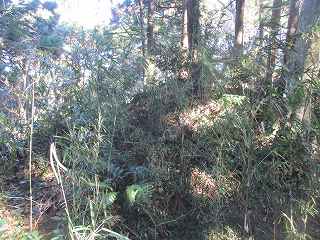 この辺りから南西側には一段低い腰曲輪のような部分があるが、ここにもかつて屋敷が建っていたのだという。現在では廃墟の残骸がわずかに残ったヤブとなっている。