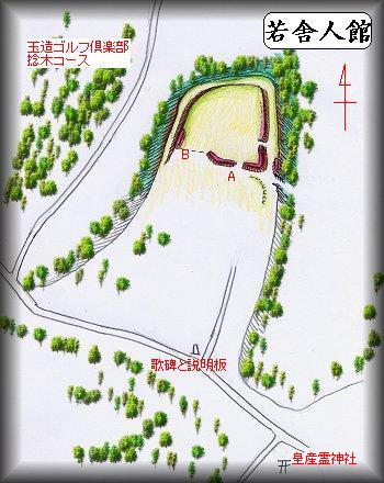 若舎人館は、玉造ゴルフ倶楽部捻木コースの東側の比高10mほどの台地の先端部にあり、「古館」と呼ばれている。東南側の皇産霊神社から北西に100mほど進んだ所に「若舎人部の歌碑」とその説明板が立っており、ここから台地先端に進んだ所が館跡となっているが、その手前には大きなお宅がある。この庭先を通らないと館に入ることができないので、見学する方は、必ずこのお宅の許可を得てからにしていただきたい。