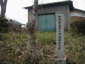 「御城」中央部平坦地の端には櫓台のような土手がある。この上には写真の「下市原尋常小学校跡地之碑」や何かの供養塔が建っている。かつて小学校になっていたとすると、その頃から台地上の地形は徐々に変えられてしまっていたことであろう。その後宅地化も進んで、明確な遺構が失われてしまったものかと思われる。