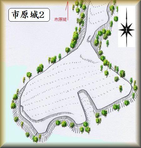 市原城については、上記市原城のところで述べている通りであるが、『茨城県遺跡地図』は市原城をその位置ではなく、南西300mほどのところにある比高10mの台地に印を付けている。尾根続きに市原城と接続する台地である。