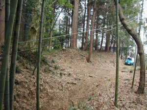 この山頂部は、かつては耕作地であったようだが、現在、耕作は放棄され、北側半分は一面の笹薮となってしまっている。しかし、南側半分は杉林で歩きやすく、周囲に切岸、腰曲輪、土塁なども一部残っている。