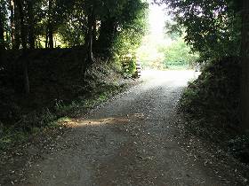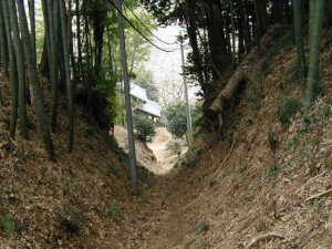 | 写真左手が城の東側の土塁である。この南の先が下の写真の切通しにつながっている。 | これがその切通し。竪堀のようになって台地下に降りている。 宍戸氏は、宍戸本城の支城として、湯崎城を築き、家臣の上野氏を城主として配したという。この上野氏が、湯崎本城を守るためにさらに出城として築いたのが、この東の長兎路城と、北西の住吉城であったという。 |