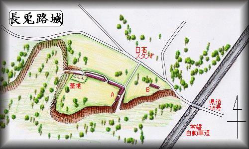 長兎路城は、涸沼川に臨む比高10mほどの台地の先端部にあった。湯崎城の出城の1つで、湯崎城の東900mほどの所である。県道16号線と常磐自動車道が交差する地点の300mほど北東である。ガソリンスタンドの100mほど西側の道を南に入っていくと、すぐに土塁が見えてくる。方形に囲まれた土塁で、高さは2mほど。東側は切通しとなって、台地下に続いている。南側は台地先端部。北側の外側には堀があったらしく、一部痕跡が残っているが、道路となって大方埋められている。西側は墓地となり改変されているが、ほぼ80m×30mほどの郭である。これが中心的な郭で、おそらくこの周囲も城域であったであろうと推測されるのであるが、周囲にははっきりとした遺構は見られなくなっている。下の写真は、先の細い道を城址まで入ってきた所で、南側から土塁を見たところ。