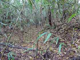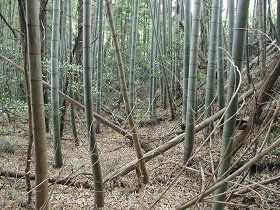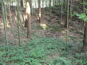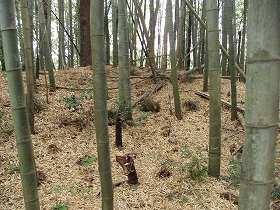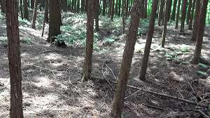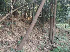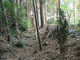| 山頂北側の部分。かつては耕作地であったようだが、現在では放棄され、一面尾ヤブだらけになってしまっている。正面奥が土塁の高まりのように見えるが、実際には背の高い笹が繁茂しているにすぎない。 | 頂上南側の部分は杉林となっており、歩きやすい。南側には切岸や腰曲輪が残っており、その辺りには城郭らしい雰囲気が残されている。 |