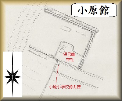 ただ、西側は何の加工もない緩やかな傾斜地系となっており、その点でははなはだ不完全な印象を受ける。城郭と断定するのも、ちょっと気が引けてしまう。神社の下には「小原小学校跡地」を示す碑が立っているのだが、あるいは小学校に関連する施設であった可能性もあるのではないだろうか。
