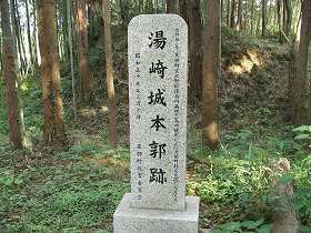 | (以前の記述)宍戸氏が、宍戸城を守るための支城として築いたのが湯崎城であるという。湯崎城は住吉城とも呼ばれた。 城址の位置は根田池の北側で、この池はかつて外堀としての役割を果たしていたものであろう。県道16号線を本覚寺に向かって走っていくと「湯崎城本郭跡200m」という案内板がある。案内の通りに200m進むと右手が本覚寺、左手が湯崎城本郭である。この間の道はそのまま池まで下っていくのであるが、これもかつての堀切の名残であったかもしれない。 左手に入っていくと両側に空堀と土塁が広がる虎口が見える。虎口の左側の手前に写真の城址碑が建っている。碑の背後が空堀で、その奥に見える土塁は櫓台状になっている。土橋を渡って虎口を通るとそこが本郭なのであろうが、ここは民家になっており牛小屋などがある。遺構はこの辺りが中心であるが、もっとよく周辺を歩けば、あちこちに遺構を発見できるかもしれない。 |