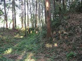 しかし、山林内部には、痕跡的となりながらも、城館跡と思われる区画が存在している。左の写真は南西側の堀の中央部にある土橋を郭内側から見たところである。