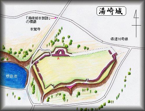 湯崎城は、根田池の北東側、本覚寺の東側一帯にあったので、この池や寺院を目指して行けばなんとなく分かると思う。県道16号線沿いには「湯崎城本郭跡200m」という案内標識があるので、これに従って進んでいくと、Aの虎口の入り口近くまで来るので、後は車を留めて歩いていけばすぐに土塁と堀が見えてくる。 城は南側の沼沢地に突き出した比高10mほどの台地の先端部を利用したもので、三方向は切岸、腰曲輪によって防御し、台地続きに当たる北側は堀と土塁とを配備して防御を固めていた。現在、城址一帯は果樹園となっているので、北側の堀と土塁は、Aの周囲を除いて多くの部分が埋められてしまっている。この部分が直線的につながっていたとしたら、図のような感じであったかと思われるが、Aの部分のような張り出しが他にもあり、もっと複雑な塁線を描いていた可能性もあると思う。