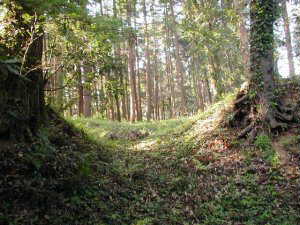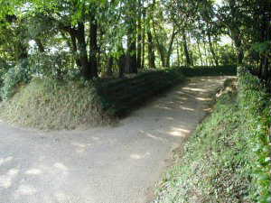| 2郭南側の堀。きれいに残っているが、だいぶ埋められている感じがする。 | 同じく2郭南側の堀の東部分。幅が広く、20m近くある。ここは水堀であったろう。 |